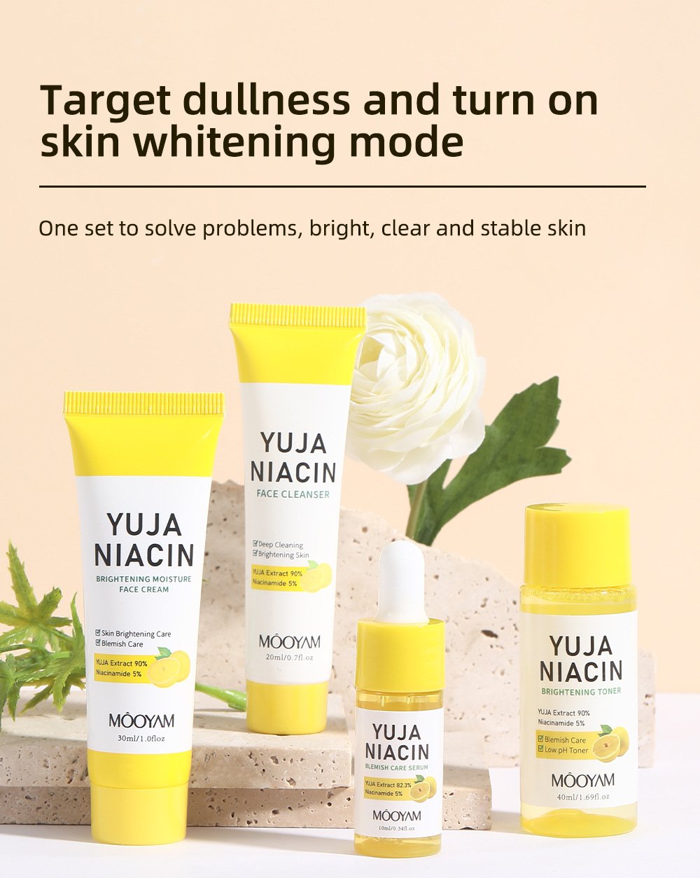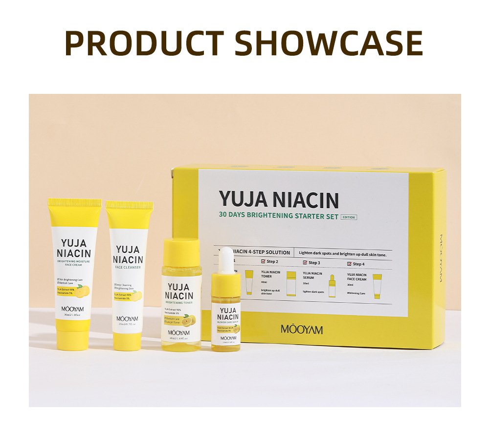 Ei brightening travel skincare kit e ache niacinamide enriched cleanser, toner, serum & cream—sob gulo yuzu extract দিয়ে infused। Skin dullness কমায়, hydration দেয় এবং glowing, fresh look তৈরি করে। Daily use & travel—দুটোর জন্যই perfect।